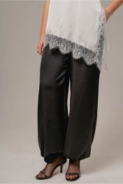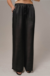 Брюки молодежные прямого силуэта из дабл шелка однотон, на притачном поясе с эластичной тесьмой,шнурок, и наклонными карманами спереди, и иммитацией гульфика. на кулисе по низу с фиксаторами Длина по боковому шву 105 см, ширина по талии в стянутом виде 34,36,38,40см (42,44,46,48рр) ширина по бедрам 53,55,57,59см соответственно