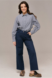 Молодежная блузка ( рубашка) в мелкую клетку , обьемного прямого силуэта,со спущенной линией плеча, с рукавом до запястья на манжете с застежкой на 2 пуговицы, с отложным воротником на стойке. Перед с центральной застежкой на пуговицы, и с закругленной линией низа,спинка с низкой кокеткой и бантовой складкой по центру от кокетки вниз. На воротнике пришита аппликация декор симметрично с двух сторон. Длина 67 см. ширина по линии груди 58,5;60,5см. (42-44,46-48рр) ширина по низу 61,63см Длина рукава 55см длина плеча 25,5 см
