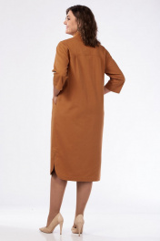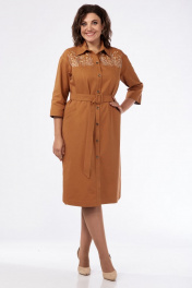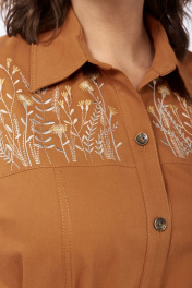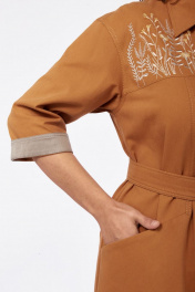 Платье женское прямого силуэта изготовлено из х/б плательной ткани. Воротник рубашечного типа, застежка центральная планка на петли и пуговицы. Перед с кокетками и фигурными рельефами, в которых обработаны карманы. По спинке кокетка со складками. Рукав слегка спущенный, длиной ¾ с манжетой из отделочной ткани, Низ платья фигурной формы, обработан обтачкой. Пояс из основной ткани с пряжкой. Платье декорировано вышивкой. Обращаем Ваше внимание, что цвет на экране может отличаться от реального. Длина платья по спинке – 114 см, рукава — 42 см. р.52 – ПОГ 58 см, ПОБ 61 см, р.54 – ПОГ 60 см, ПОБ 63 см, р.56 – ПОГ 62 см, ПОБ 65 см.