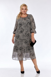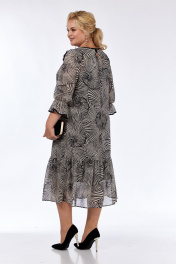 Платье женское, нарядное, А — силуэта, выполнено из тонкой плательной ткани. Горловина по переду с драпировкой и обработана окантовкой из отделочной ткани. Спинка со средним швом в котором расположен фигурный вырез у горловины. Рукава втачные, нижний срез обработан окантовкой из отделочной ткани. Рукав присобран на резинку которая создает эффект сборки. По низу платья широкая сборка. Изделие на чехле. В комплекте съемный цветок. Обращаем Ваше внимание, что цвет на экране может отличаться от реального. Длина платья по спинке — 118 см. Длина плеча — 9 см, длина рукава — 51 см. р.52 — ПОГ 58 см ПОБ 62 см, р.54 — ПОГ 60 см ПОБ 64 см, р.56 — ПОГ 62 см ПОБ 66 см.