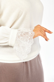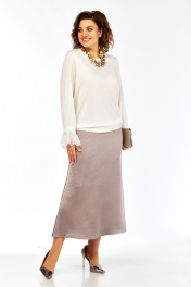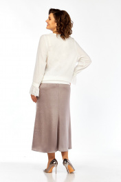 Комплект женский нарядный, состоит из джемпера и юбки. Джемпер выполнен из трикотажного полотна с икринкой. Перед и спинка цельнокроеные. Горловина круглой формы. Рукава втачные, по низу декоративные элементы с кружевом. Низ изделия с притачной деталью. Юбка — годе выполнена из костюмно — плательной ткани с застежкой на потайную тесьму-молнию в среднем шве заднего полотнища. Юбка на подкладке. Длина джемпера по спинке — 67 см, длина плеча — 8,5 см, длина рукава — (19-21) см. р.52 — ПОГ 60 см ПОБ 54 см, р.54 — ПОГ 62 см ПОБ 56 см, р.56 — ПОГ 64 см ПОБ 58 см. Длина юбки по боковому шву — 90 см. р.52 — ПОТ 44 см ПОБ 57 см, р.54 — ПОТ 46 см ПОБ 59 см, р.56 — ПОТ 47 см ПОБ 61 см.