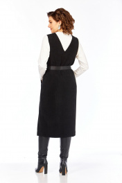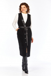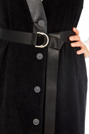 Сарафан прямого силуэта из трикотажного полотна с имитацией вельвета. Горловина V -образной формы с отделкой из экокожи. Застежка центрально — бортовая на петли и пуговицы. По переду нагрудные вытачки и обработаны карманы с листочками. На спинке фигурный вырез. Сарафан на подкладке. Длина сарафана по спинке — 118 см. р.52 — ПОГ 58 см ПОБ 60 см, р.54 — ПОГ 60 см ПОБ 62 см, р.56 — ПОГ 62 см ПОБ 64 см, р.58 — ПОГ 64 см ПОБ 66 см.