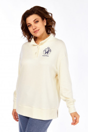 Комплект женский брючный двухпредметный, состоит из джемпера и брюк. Джемпер свободного кроя, изготовлен из трикотажного полотна. Горловина обработана воротником-стойкой и планками с застежкой на петли и пуговицы. Рукава спущенные, с манжетами. По низ изделия притачная деталь с разрезами по бокам. На полочке джемпера расположена вышивка. Брюки прямого силуэта, выполнены из трикотажного полотна. В передних деталях брюк обработаны карманы. Пояс притачной на эластичной тесьме. Длина джемпера по спинке — 69 см, длина плеча + рукав — 76 см. р.52 — ПОГ 62 см ПОБ 61 см, р.54 — ПОГ 64 см ПОБ 63 см, р.56 — ПОГ 66 см ПОБ 65 см. Длина брюк по боковому шву -109 см. р.52 — ПОТ 38 см ПОБ 55 см, р.54 — ПОТ 40 см ПОБ 57 см, р.56 — ПОТ 42 см ПОБ 59 см.