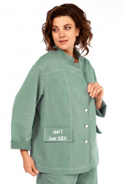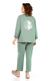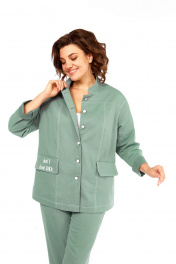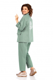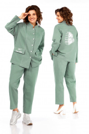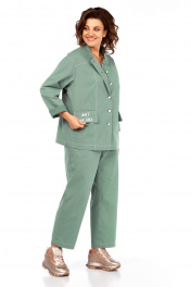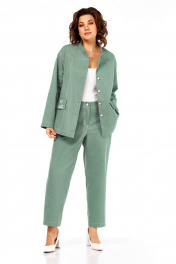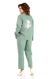Костюм брючный двухпредметный, состоит из жакета и брюк, выполнен из ткани костюмно-плательного ассортимента. Жакет прямого силуэта. Горловина обработана воротником — стойка, застежка центрально — бортовая на петли и пробивные пуговицы. Перед с кокетками и рельефами выходящими из них. Имеются прорезные карманы с клапаном. Спинка на кокетке. Рукава рубашечного типа. Жакет дополнен печатью. Брюки свободного силуэта слегка заужены к низу. Пояс притачной, частично на эластичной тесьме, с застежкой на петлю и пробивную пуговицу. По переду обработаны карманы с листочкой и подрезным бочком. Вдоль швов костюма проходят контрастные строчки из отделочных ниток. Длина жакета по спинке — 69 см, длина плеча + рукав — 74 см. р.50 — ПОГ 59 см ПОБ 60 см, р.52 — ПОГ 61 см ПОБ 62 см, р.54 — ПОГ 63 см ПОБ 64 см, р.56 — ПОГ 65 см ПОБ 66 см. Длина брюк по боковому шву — 100 см. р.50 — ПОТ 37 см ПОБ 55 см, р.52 — ПОТ 39 см ПОБ 57 см, р.54 — ПОТ 41 см ПОБ 59 см, р.56 — ПОТ 43 см ПОБ 61 см.
