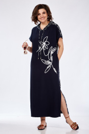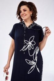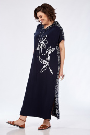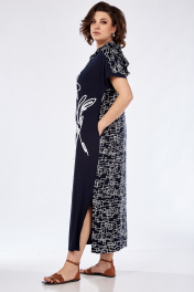 Платье женское, прямого силуэта, выполнено путем комбинирования тканей двух видов: вискозного трикотажного полотна и принтованной вискозной ткани. Горловина обработана капюшоном. Перед с нагрудными вытачками. Спинка цельная. Рукава цельнокроенные с притачной манжетой. В боковых швах обработаны карманы и разрезы. Платье декорировано дизайнерской вышивкой. Длина платья по спинке — 128 см, длина плеча — 30 см. р.50 — ПОГ 56 см ПОБ 60 см, р.52 — ПОГ 58 см ПОБ 62 см, р.54 — ПОГ 60 см ПОБ 64 см, р.56 — ПОГ 62 см ПОБ 66 см, р.58 — ПОГ 64 см ПОБ 68 см, р.60 — ПОГ 66 см ПОБ 70 см.