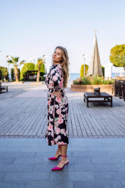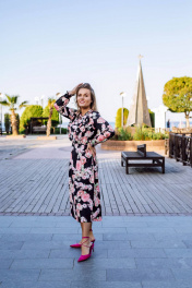 Элегантное платье миди с цветочным принтом. Платье имеет прямой силуэт и длинные рукава, что делает его подходящим для различных погодных условий. Контрастный принт с крупными розами придает платью яркость и выразительность. Платье имеет пояс, подчеркивающий линию талии, создавая более женственный силуэт.Длина изделия-120 см, длина рукава-56 см