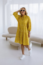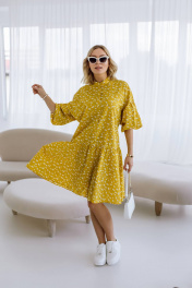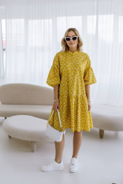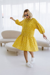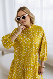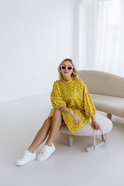 Яркое жёлтое платье мини свободного кроя сразу привлекает внимание. На ткани нанесён мелкий цветочный принт белого цвета, добавляющий образу нежности. Рукава платья широкие, укороченные, с присборенным низом, что создаёт эффект фонарика. Воротник-стойка подчёркивает линию шеи, добавляя лаконичности. Платье выглядит удобным и стильным, идеально подходящим для летнего дня.Длина изделия-98см, длина рукава-25 см