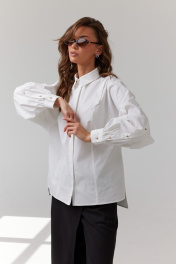 Блузка женская прямая с центральной потайной застежкой на петли и пуговицы. Перед с отстрочными рельефами, в которых вставлен декоративный элемент в виде планки из основной ткани. Спинка цельнокроеная. В боковых швах обработаны разрезы. Низ ассиметричный, перед короче спинки. Пройма углублена и слегка спущена. Рукав типа «летучая мышь» с функциональной застежкой по всей длине рукава со стороны спинки на петли и декоративные пуговицы. Низ рукава присборен и обработан притачной манжетой, застегивающейся на петлю и пуговицу. По горловине воротник рубашечного типа с отрезной стойкой. Декоративные элементы и фурнитура могут отличаться от заявленных на фото. Цвет материала может отличаться по тону в зависимости от настроек вашего монитора!