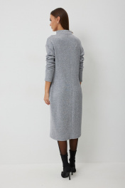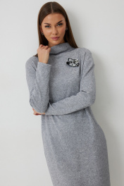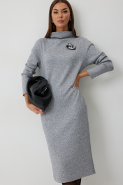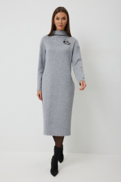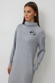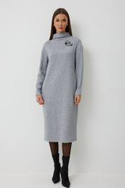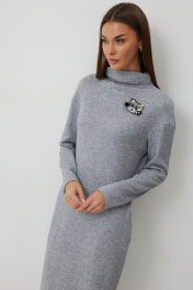 Платье трикотажное полуприлегающего силуэта с карманами в боковом шве. Длина платья до середины икры. Платье с цельнокроеной горловиной и спущенной линией плеча. Спинка со средним швом. Платье дополнено съемным авторским декором. Длина изделия по спинке 112см, длина рукава от плеча 70 см.