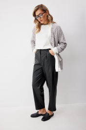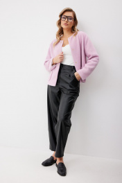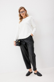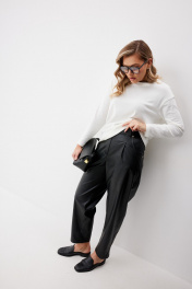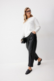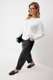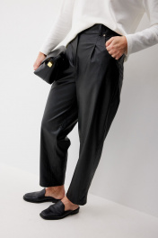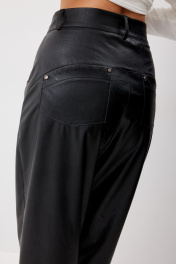 Брюки женские из искусственной кожи зауженные к низу. На передних частях брюк обработаны карманы с отрезным бочком и застрочены складки. По концам кармана установлены хольнитены. По спинке брюк накладные карманы с хольнитенами на концах и отрезной кокеткой. Верхний срез брюк обработан отрезным поясом со шлевками. Брюки застегиваются по переду на «молнию» в гульфике и кнопку по поясу. Длина по боковому шву 97,5 см.