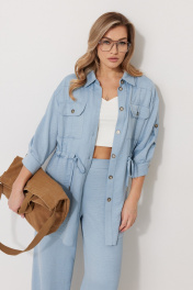 Костюм женский состоящий из блузки с брюками. Блузка прямого силуэта, по спущенной линией плеча, длиной за линию бедра. По переду блузки настрочены накладные карманы с клапаном. Клапан застегивается на петлю и пуговицу. По спинке отрезная кокетка с декоративным элементом. По переду и спинке, в районе талии располагается кулиска. Рукав втачной двухшовный ¾ длины. Низ рукава со складкой обработан притачной манжетой, застегивающейся на петлю и пуговицу. В разрезе рукава располагается пата, застегивающаяся на петлю и пуговицу. Застежка блузки центральная на отрезные планки, застегивающиеся на петли и пуговицы. Горловина блузки обработана рубашечным воротником с отрезной стойкой. Брюки женские, прямого силуэта. По переду обработана имитация застежки. Карманы расположены в боковом шве. На задних половинках брюк застрочены вытачки. Верх обработан притачным поясом (частично на резинке). Длина спинки жакета 81 см, длина рукава 57 см, длина брюк по боковому шву 109 см.
