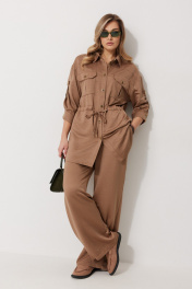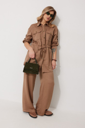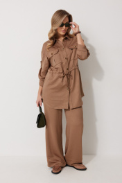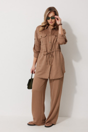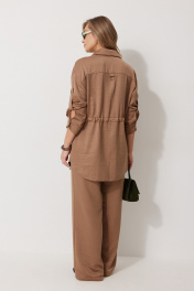 Костюм женский состоящий из блузки с брюками. Блузка прямого силуэта, по спущенной линией плеча, длиной за линию бедра. По переду блузки настрочены накладные карманы с клапаном. Клапан застегивается на петлю и пуговицу. По спинке отрезная кокетка с декоративным элементом. По переду и спинке, в районе талии располагается кулиска. Рукав втачной двухшовный ¾ длины. Низ рукава со складкой обработан притачной манжетой, застегивающейся на петлю и пуговицу. В разрезе рукава располагается пата, застегивающаяся на петлю и пуговицу. Застежка блузки центральная на отрезные планки, застегивающиеся на петли и пуговицы. Горловина блузки обработана рубашечным воротником с отрезной стойкой. Брюки женские, прямого силуэта. По переду обработана имитация застежки. Карманы расположены в боковом шве. На задних половинках брюк застрочены вытачки. Верх обработан притачным поясом (частично на резинке). Длина спинки жакета 81 см, длина рукава 57 см, длина брюк по боковому шву 109 см.