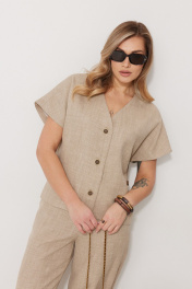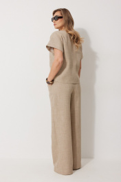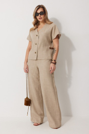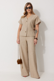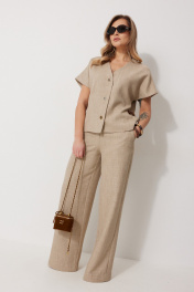 Костюм женский, состоящий из жилета и брюк. Жилет прямого силуэта на подкладке со спущенной линией плеча длиной до линии бедра. Спинка с центральным швом. Горловина V-образной формы обработана подбортом с обтачкой. Застежка жилета центральная на декоративные пуговицы. Брюки женские, прямого силуэта. По переду обработана застежка на молнию. Карманы наклонные с отрезным бочком. На задних половинках брюк застрочены вытачки. Верх обработан широким притачным поясом (частично на резинке), застегивающимся на петлю и пуговицу Длина спинки жакета 61 см, длина рукава 34 см, длина брюк по боковому шву 109 см.
