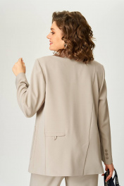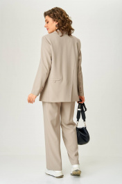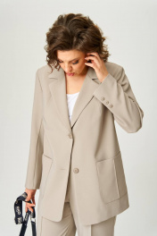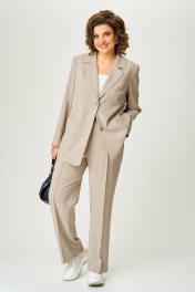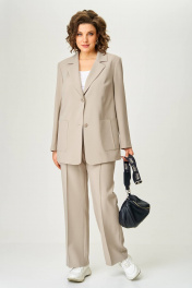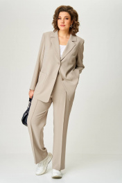 Костюм: жакет, брюки. Выполнен из текстильной костюмной ткани. Жакет частично на подкладке. Силуэт прямой. Покрой рукава втачной двушовный, шлица в локтевом шве. Воротник пиджачный. По переду большие накладные карманы с тонким застроченым кантом. Застежка центральная на 2 петли и пуговицы. На спинке дакета выполнен декоративный элемент в виде кармана с листочкой и подреза. Брюки прямые, пояс притачной, частично на резинке. Застежка гульфик. По передним половинкам по центру застрочены узкие канты.