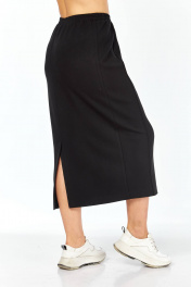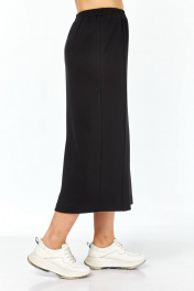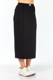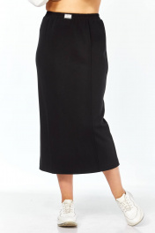 Юбка выполнена из высококачественного трикотажного полотна чёрного цвета. Силуэт прямой, слегла заужен к низу. Пояс на узкой резинке с декоративной нашивкой по центру спереди. По передней половине юбки застрочены канты. Сзади в среднем шве юбки шлица для хода. Юбка без застёжки, без подкладки.