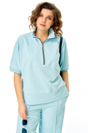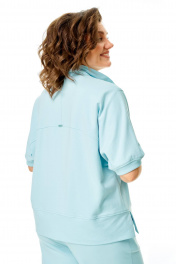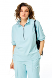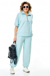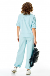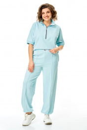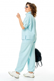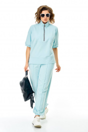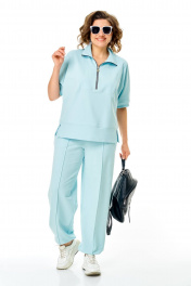 Комплект: джемпер, брюки. Выполнен из хлопкового трикотажного полотна средней плотности ( 2-ух нитка). Джемпер свободного силуэта, линия плеча спущена. Низ рукава обработан трикотажным довязом. По переду декоративные подрезы. Воротник стойка, молния. Спинка аналогично переду имеет фигурные подрезы. Брюки прямого свободного силуэта, к низу на резинке. Карманы в боковых швах. Пояс на резинке, нашита декоративная эмблема. По передним половинам брюк застрочен кант.