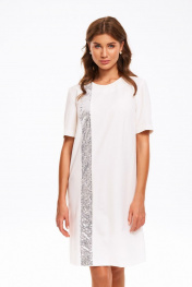 Платье женское умеренного объема, прямого силуэта. Перед с нагрудными вытачкаи и декоративной вертикальной деталью, выполненной из отделочного материала – «пайетки». Спинка со средним швом и застежкой на потайную «Молнию». Рукав втачной, короткий. Платье длиной до линии колена. Длина изделия - 101 см Длина рукава - 28 см