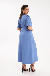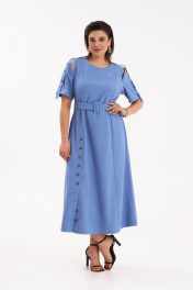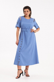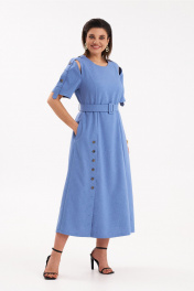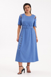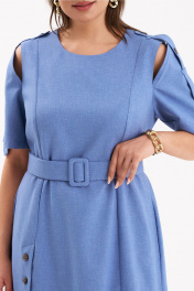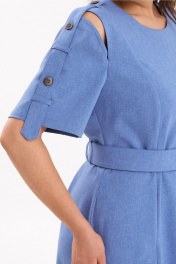 Силуэтное платье с разрезами на плечах и декоративными патами на рукавах. По переду два рельефа, проходящих через центр груди. По низу рельефа справа шлица с регулируемой длиной разреза за счёт застёжки на пуговицы. Платье застёгивается на потайную молнию на спинке. Комплектуется текстильным ремнём. Длина платья - 128 см.