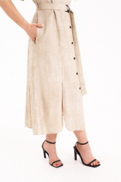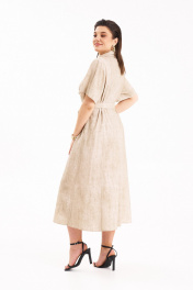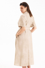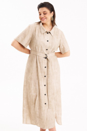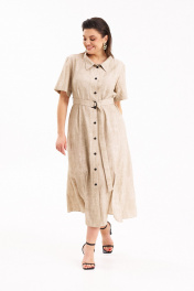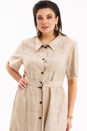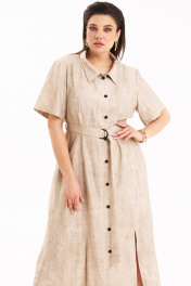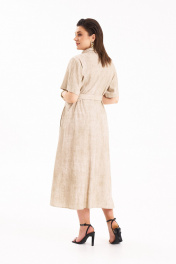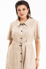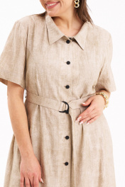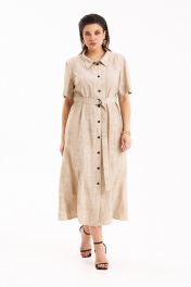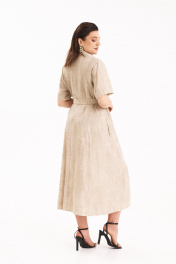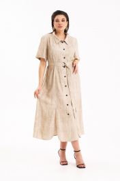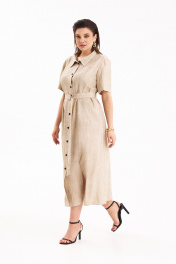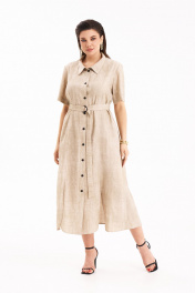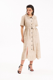 Платье-рубашка А-образного силуэта длиной миди с рукавом до локтя, рубашечным воротником и центральной застёжкой на контрастные пуговицы. По переду изделия идут рельефы переходящие в фигурные разрезы снизу. В боковых швах карманы. Комплектуется текстильным ремнём с пряжкой