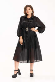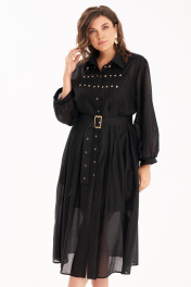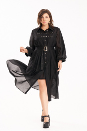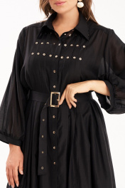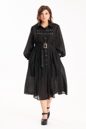 Платье А-силуэта из лёгкой вискозной вуали с рубашечным воротником и застёжкой на планку с пуговицами. По переду от плеча к талии заложены складки декорированные золотыми пуговками. Рукав длиной 7/8 на манжете. Комплектуется нижним платьем-комбинацией. Длина 46-56р - 120 см. Длина рукава 46-50р -53см, 52-56р - 53,5см. _x000D_ _x000D_