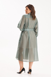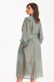 Платье А-силуэта из лёгкой вискозной вуали с рубашечным воротником и застёжкой на планку с пуговицами. По переду от плеча к талии заложены складки декорированные золотыми пуговками. Рукав длиной 7/8 на манжете. Комплектуется нижним платьем-комбинацией. Длина 46-56р - 120 см. Длина рукава 46-50р -53см, 52-56р - 53,5см. _x000D_ _x000D_
