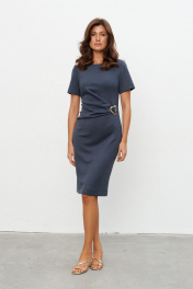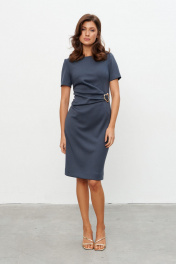 Платье из трикотажного полотна прилегающего силуэта с коротким, втачным рукавом. Длина платья выше колена. Перед изделия задекорирован мягкой драпировкой в области талии с декоративной металлической пряжкой. Сзади разрез и застёжка на потайную молнию. Длина по середине спинки 44-48р - 103 см 50-54р - 106 см Длина рукава 44-48р - 21 см 50-54р - 22 см