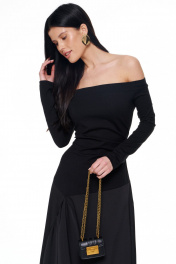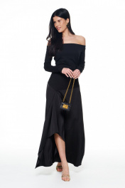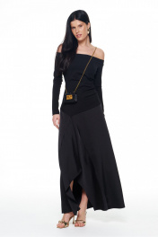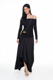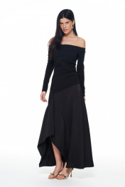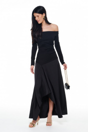Платье длины макси выполнено на сочетании мягкого, трикотажного полотна и струящегося атласа. Лиф изделия без плечей плотно держится на фигуре засчёт плотного прилегания. По переду в области талии заложены складки. Атласная юбка асимметричная с большим расклешением. Длина изделия 42-46р - 124см; Длина рукава 42-46р - 54.5см.