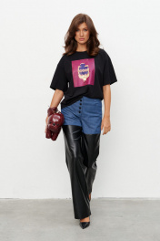 - ОписаниеБрюки прямого силуэта выполнены на сочетании плотного джинса и экокожи. Брюки на поясе со шлёвками и застежкой на металлические пуговицы-болты. По переду два прорезных кармана, по спинке - два накладных. Длина брюк от талии 44-48р - 109 см 50-54р - 110,5 см