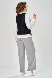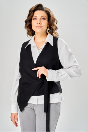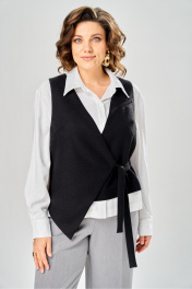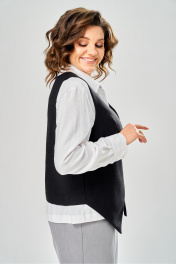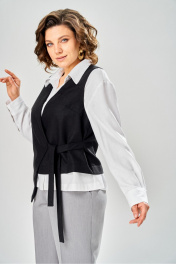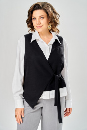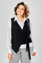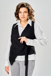 Жилетка полуприлегающего силуэта с фигурным передом. По левому переду расположен прорезной карман обманка. Застежка на потайную кнопку и пояс. Спинка разрезна. Низ обработан на обтачке. Изделие без подкладке. Длина жилетки по среднему шву 50см