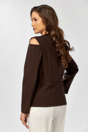 Жакет полуприлегающего силуэта. По полочке и спинке расположена отлетная кокетка, по низу изделия баска. Рукава длинные с открытым плечом. Структурированные плечи. Застежка на петли пуговицы. Жакет без подкладки. Низ изделия подшит на плоскошовной машине. Длина рукава56см; Длина жакета по среднему шву 61см.
