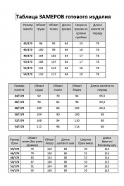 Женский комплект, состоящий из жакета, жилета и брюк. Универсальный женский жакет на подкладке прямого силуэта. Перед с центральной застежкой на одну пуговицу, с карманами и с клапанами в шве. Воротник стояче-отложной втачной с отворотом лацкана. Рукав двухшовный, втачной. Жилетка женская умеренного объема полуприлегающего силуэта. Перед с талиевыми вытачками и имитацией карманов с листочкой. Спинка с талиевыми вытачками. Жилетка на притачной подкладке. Застежка центральная, на прорезные петли и пуговицы. Брюки женские большого объема, прямого силуэта, вида «палаццо». На передних половинках брюк по линии талии заложены две односторонние складки, направленные в сторону бокового шва и функциональные карманы с отрезным бочком. На задних половинках находятся по две талиевые вытачки. Пояс отрезной, притачной. На поясе шлевки. Верхний край пояса расположен на естественной линии талии. Застежка брюк – классический гульфик. Застежка пояса на две пуговицы и две петли. Длина брюк в пол. Длина брюк по боковому шву с поясом - 118 см