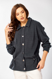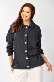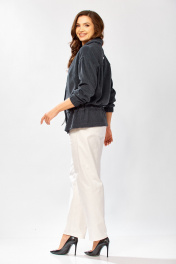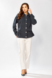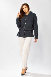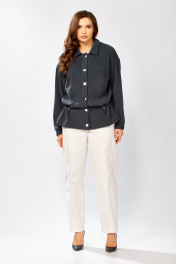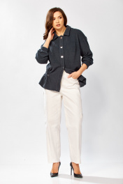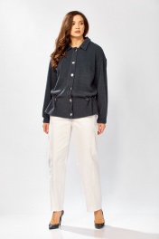 Бомбер прямого силуэта с длинными спущенными рукавами, низ рукава обработан резинкой. По спинке кокетка, на кокетке пришит декоративный элемент. По переду карман обманка. Застежка на петли пуговицы. Низ изделия подшит на плоскошовной машине. На линии талии настрочена кулиса, регулируется по ширине. Застежка на петли пуговицы. Жакет без подкладки. Низ изделия подшит на плоскошовной мшине. Брюки прямого силуэта с отсрочеными кантами на 0.2 см по переднему и заднему полотнищу. На переднем полотнище брюк расположены карманы. Верх пояса обработан поясам с резинкой, в пояс вставлен декоративный шнурок с наконечниками. Низ брюк обработан швом с открытым срезом. Длина рукава 75см; Длина спинки по среднему шву 66см; Длина брюк по боковому шву 105 см.