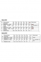 Костюм состоящий из жакета и брюк. Жакет прямого силуэта со спущенной линией плеча и двубортной застёжкой. Все края жакета с сырыми срезами, которые отстрочены контрастной ниткой. Спереди два кармана с клапанами. Брюки прямые от бедра на резинке по талии с карманами по бокам. Длина жакета 48-58р - 71 см. Длина рукава 48-52р - 56,5 см, 54-58р - 58см .Длина брюк от талии 48-58р - 113 см.