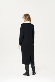 Элегантное женское платье из трикотажного полотна с добавлением вискозы, удлиненное, прямого силуэта, рукав втачной, длинный. По переду подрез, ниже подреза клапан и отлетные детали из экокожи. Воротник-хомут из сочетания трикотажного полотна и белой экокожи. По спинке в среднем шве разрез.