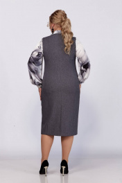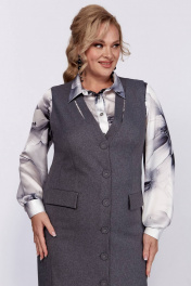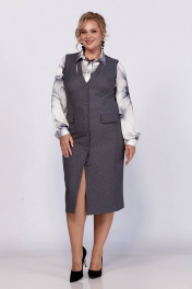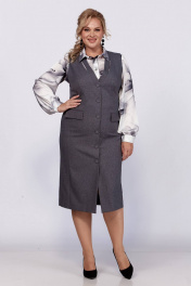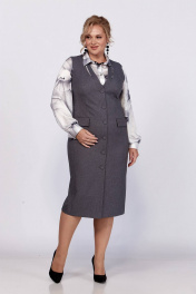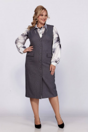 Элегантный женский комплект, состоящий из сарафана и блузки. Сарафан выполнен из вискозной костюмной ткани средней плотности. Сарафан удлиненный, полуприлегающего силуэта, вырез горловины у-образный с декоративной планкой со щелями, по переду функциональные прорезные карманы с клапаном, по спинке в среднем шве шлица. Блузка классического покроя из принтованной непрозрачной ткани с добавлением шелка. Силуэт прямой, воротник рубашечного типа, по переду центральная застежка на пуговицы, рукав длинный с отворачивающимся манжетом