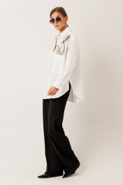 Блузка из хлопковой ткани: – свободный силуэт – модель комфортная и подходящая для разных типов фигуры – по переду — дизайнерский принт и накладной карман – спинка удлинённая – фигурный низ и разрезы по боковым швам – застёжка сквозная на потайные петли и пуговицы – воротник рубашечного типа – спинка с горизонтальной кокеткой и глубокой бантовой складкой от кокетки