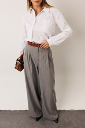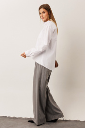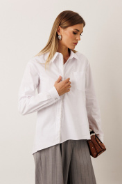 Блузка из хлопковой ткани: – прямой силуэт – асимметричная застёжка – по переду — накладной карман – в планку вставлена тесьма с декоративными жемчужными бусинами – рукав длинный с манжетой и застёжкой на пуговицу