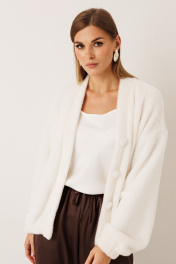 Джемпер из эко-меха: – оверсайз крой – спущенная линия плеча – по переду планка, застёжка на пуговицы – низ джемпера и рукавов — на резинке – спинка лаконичная