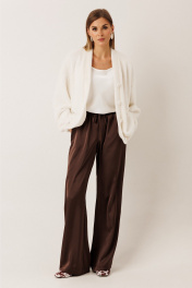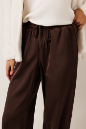 Комплект состоит из блузки и брюк: блузка из атласа: – свободный силуэт – трансформер: можно носить приталенно, застегнув потайной ремешок, или создать расслабленный образ, завязав внутренние ленты и спустив на плечи. брюки из атласа: – прямой силуэт – пояс на резинке – по переду расположены карманы