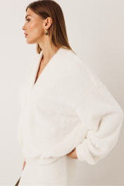 Джемпер из эко-меха: – оверсайз крой – спущенная линия плеча – по переду планка, застёжка на пуговицы – низ джемпера и рукавов — на резинке – спинка лаконичная Юбка из эко-меха: – длина мини – пояс на резинке – на хлопковой трикотажной подкладке