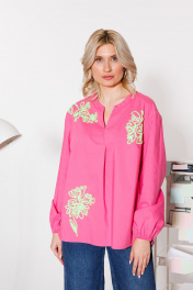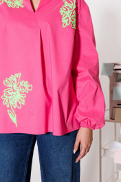 Хлопковая блузка для яркой весны. По переду расположена дизайнерская вышивка пушистым шнуром, в виде "абстрактных цветов". Вырез горловины V-образный. Рукав длинный на резинке. По боковым внизу расположены разрезы. Блузка выполнена из премиального гладкого хлопка, не «шелестит». Ткань очень приятная к телу, и легко гладится. Повседневность и комфорт – главные преимущества этой блузки. Длина блузки - 68 см