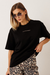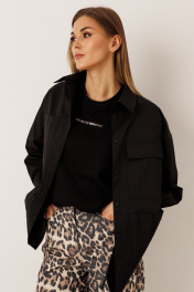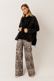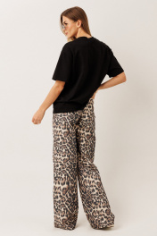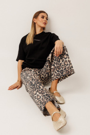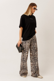 Брюки из плотного джинса: – анималистичный принт – силуэт расширенный к низу – застёжка на пуговицу и молнию – по переду — карманы – по заднему полотнищу — накладные карманы