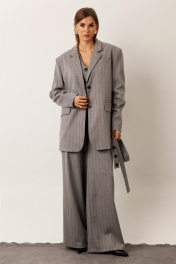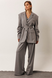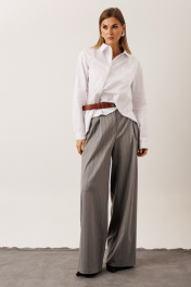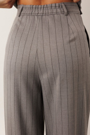 Брюки в полоску: – широкие – по переду — две складки – карманы в боковом шве – пояс по спинке на резинке (для удобства и хорошей посадки) – по боковому шву пояса — паты с декоративной пуговицей – застёжка по переду на молнию – идеальны для мягкого, свободного образа