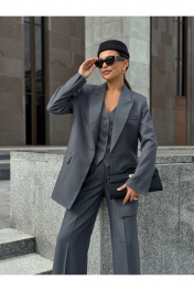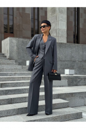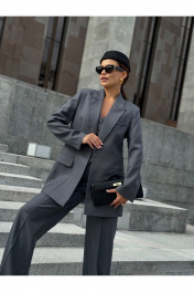 Однобортный оверсайз жакет с расширенной линией плеч выполнен из костюмной ткани премиального сегмента на подкладке. Модель прямого силуэта. Детали: отложной воротник, лацканы заостренной формы, спереди прорезные карманы. Состав подкладки 50%вискозы, 50% ПЭ. Уход за изделием: химчистка. Длина жакета по спинке 76 см. Длина рукава 61 см. К жакету имеются брюки палаццо арт.19BR11, брюки классические арт. 20BR10, жилет арт.11G2 и платье-сарафан арт.42PL5