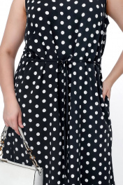 Женское платье трапециевидного силуэта с разрезом в боковом шве. По спинке - шов и "слезка". В боковых швах – карманы, тонкие завязки по талии. Ткань- штапель в горошек. Рост 170.