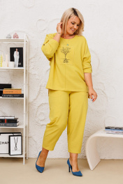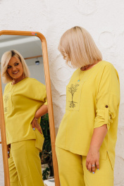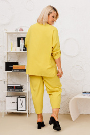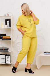 Женский брючный комплект двойка, состоящий из туники и брюк. Туника свободного силуэта, без застежки. По середине переда отстрочен декоративный кант. Вырез горловины округлый. Линия плеча спущена, рукав длиной 3/4, с застежкой на пату. По полочке на уровне груди настрочена декоративная деталь с вышивкой. Спинка прямая, длиннее переда. В боковых швах небольшие разрезы . Брюки широкие, силуэта бананы. По передним полотнищам вытачки от пояса до середины бедер и две встречных на уровне колена. В боковых швах функциональные карманы. Пояс притачной с резинкой и продетым шнурком. Фурнитура может отличаться от представленной на фотографии."