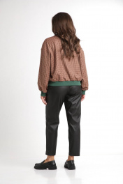 Жакет-бомбер свободного силуэта, на подкладке, застежка центральная на пробивные кнопки. Горловина, низ бомбера и манжеты рукавов обработаны высококачественным довязом ("кашкорсе"). Линия плеча спущена. Рукав втачной, одношовный. На левой полочке выполнена декоративная вышивка.