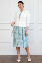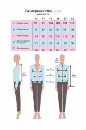 Жакет женский, универсальный, укороченный. Полуприлегающего силуэта с центральной застежкой на два крючка. На передних деталях и деталях спинки есть рельефы. Горловина круглая. Рукава втачные, двухшовные, длина ¾. Жакет частично на подкладке, только по переду, спинка без подкладки. Ткань имеет стрейч, базовый цвет. Жакет смотрится элегантно, современно и отлично подойдет, как для повседневной носки, так и для торжества. Его можно комплектовать с различными юбками, брюками, платьями. Обхват груди: 42 размер-92см,44размер-96см,46размер-100см,48размер-104см,50размер-108см,52размер-112см Обхват талии:42размер-78см, 44размер-82см, 46размер-86см, 48размер-90см, 50размер-94см,52размер-98см Длина изделия:42размер-55см, 44размер-55см, 46размер-55см, 48размер-56см, 50размер-58см,52размер-58см Длина рукава: 44размер-46см, 46размер-46см, 48размер-46см, 50размер-46см,52размер-47см.