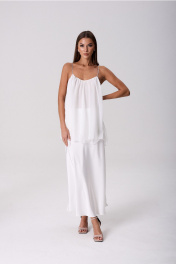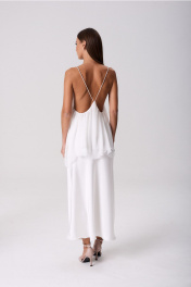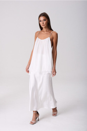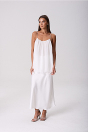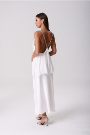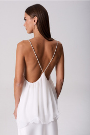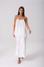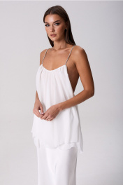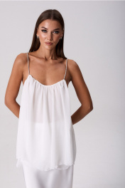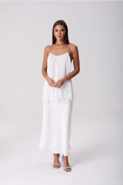 Комплект 2х предметный. Состоит из шелковой юбки миди покроенной под углом 40 градусов и двухслойной блузки -топа из легкой, воздушной ткани шифона-ёрио. Блузка свободного силуэта по переду и спинке вверху собрана на сборку, низ ассиметричный с открытым срезом, обметаным на краеобметочной машине густого и узкого краеобметочного шва. Брители выполнены из тесьмы-шнура из страз, которые очень искрится блеском.