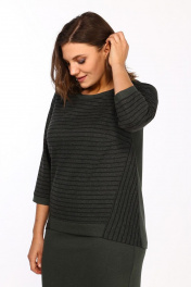Костюм женский, 2-ух предметный, состоящий из джемпера и юбки. Из трикотажного полотна. Джемпер с круглым вырезом горловины. Деталь переда с нагрудными вытачками, отрезными бочками, отдельной деталью понизу. Спинка цельная. Рукава втачные, одношовные, длиной 3/4. Низ рукавов с отделочной деталью. Юбка женская прямого силуэта. Верхний срез собран на широкую эластичную тесьму. Заднее полотнище юбки со средним швом, с разрезом. Размеры 48-52: длина джемпера 64 см, длина рукава 48 см, длина юбки 73 см.